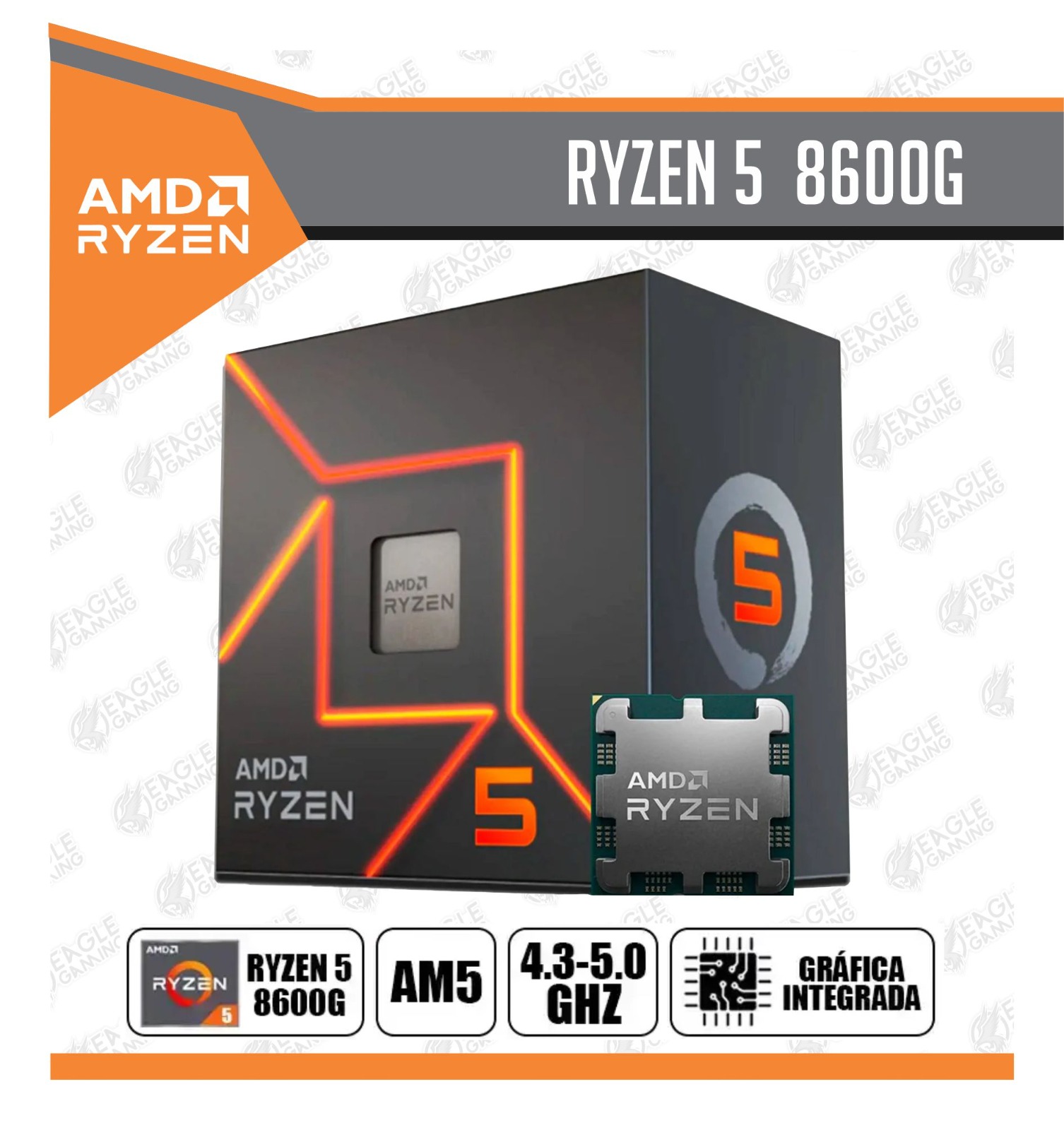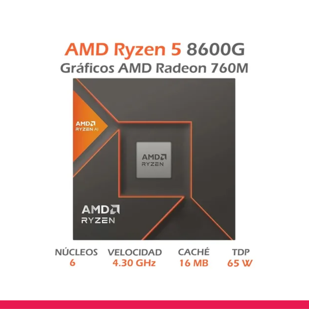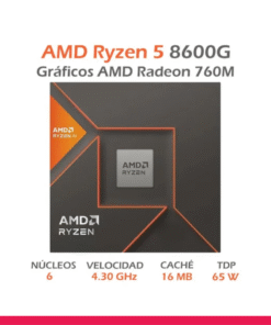 El AMD Ryzen 5 8600G es un procesador APU de escritorio compacto y potente, ideal para quienes buscan alto rendimiento sin necesidad de una tarjeta gráfica dedicada. Con 6 núcleos y 12 hilos, frecuencia base de 4.3 GHz y boost hasta 5.0 GHz, este chip Zen 4 (Phoenix) se destaca por su bajo consumo (65 W TDP), gráficos integrados Radeon 760M de alto nivel y soporte para memorias DDR5 rápidas. Perfecto para gaming 1080p, productividad diaria y sistemas compactos eficientes.