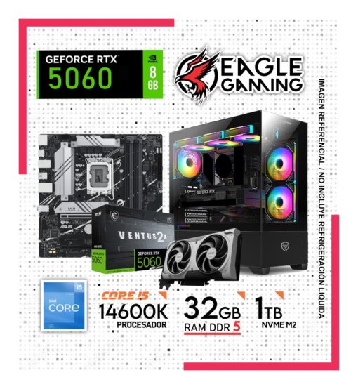Rendimiento de nueva generación para gaming competitivo y productividad avanzada. Esta poderosa PC combina la velocidad del procesador Intel Core i5-14600K de 14ª generación con la eficiencia de la memoria DDR5 y los gráficos de la RTX 5060. Ideal para juegos exigentes, creación de contenido, streaming y más.