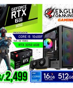 La PC Gamer Eagle Gaming con Intel Core i5-10400F y RTX 3050 de 6GB es una excelente opción para disfrutar juegos actuales con buen rendimiento y gráficos de calidad. Equipada con 16GB de RAM y un SSD NVMe de 512GB, ofrece rapidez en cargas y fluidez en multitarea. Gracias a su diseño gamer con iluminación RGB y componentes equilibrados, es ideal para jugadores que buscan rendimiento sólido a un precio accesible. Perfecta para títulos competitivos, edición básica y uso diario.