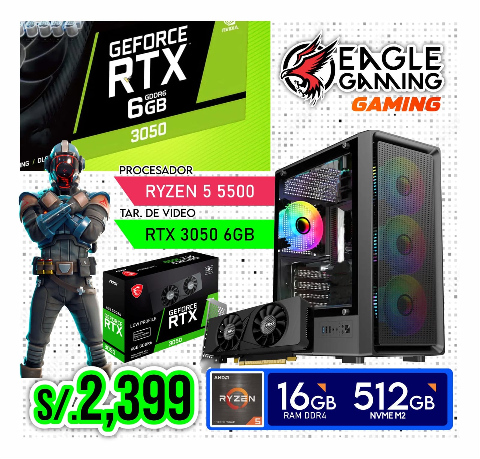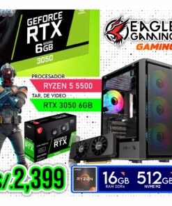 La PC Gamer Eagle Gaming con Ryzen 5 5500 y RTX 3050 6GB es una excelente opción para quienes buscan rendimiento sólido en juegos actuales a 1080p. Gracias a sus 16GB de RAM y SSD NVMe de 512GB, ofrece velocidad, fluidez y tiempos de carga rápidos. Su configuración equilibrada permite jugar títulos competitivos y AAA en calidad media-alta, además de ser ideal para streaming básico y tareas de productividad. Una PC completa, potente y lista para usar desde el primer día.